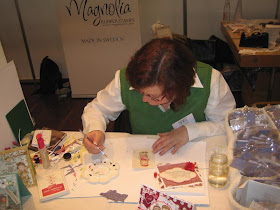 magnolia has aked my to make some demonstrations again like at the mekka in hagen. wow what a question and honour - sure i want!!! so i was stand up very early in the morning, pack all my things and drove to wiesbaden. i was there very soon and barbro and john weren´t on the stall yet.